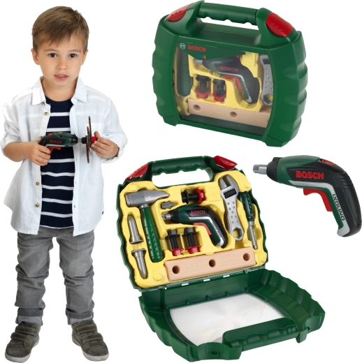 Praktische kinderkoffer met gereedschap uit de gelicentieerde BOSCH Mini-lijn van het merk Klein die elke kleine klusser zal verrassen. Bevat een functionele speelgoed accu-schroevendraaier Ixolino II met verwisselbare bits, rechts-/linksom en motorgeluid, aangevuld met een hamer, schroevendraaier, steeksleutel, schroeven, moeren en “houten” onderdelen. De stevige donkergroene koffer met transparante voorkant en dubbel rood slot houdt alles veilig bij elkaar.