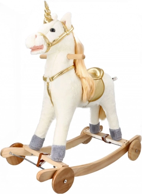 Deze betoverende gouden eenhoorn op een schommel met wielen combineert spel en verbeelding met een veilige en stabiele constructie. Kinderen beleven uren speelplezier op deze prachtige schommel met houten rockers en zacht pluche.