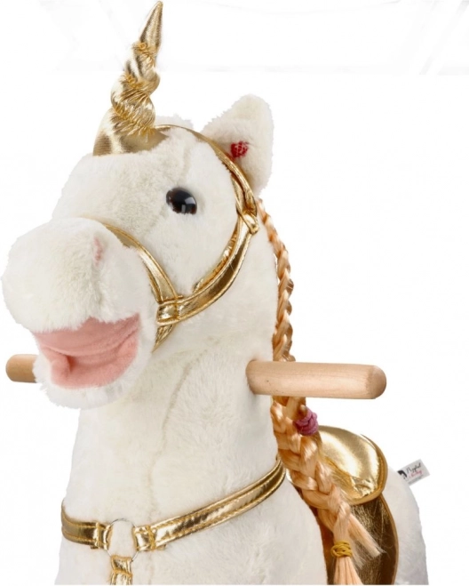 Ontdek de sensatie van rijden op deze prachtige gouden eenhoorn. Dankzij het zachte en aangename pluche biedt hij comfortabele en leuke ervaringen voor uw kinderen. De stabiele houten constructie en elegante vergulde accenten brengen een magische sfeer bij elk spel.