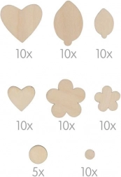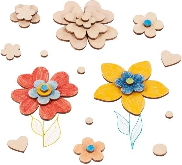 Met deze kleurrijke set houten bloemetjes maak je originele decoraties, kaartjes, afbeeldingen en seizoensversieringen. De onderdelen van 7 tot 32 mm laten zich gemakkelijk lijmen, combineren en verven, zodat kinderen hun fantasie en vaardigheid kunnen ontwikkelen.