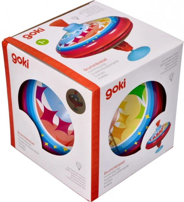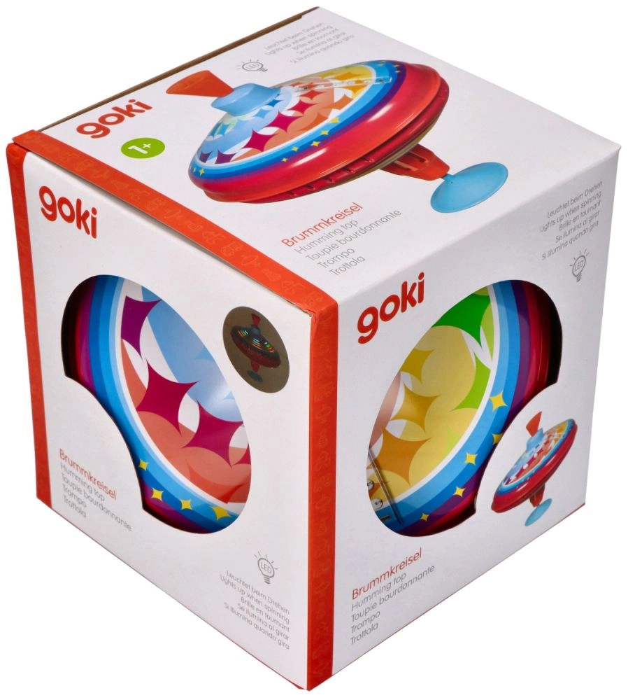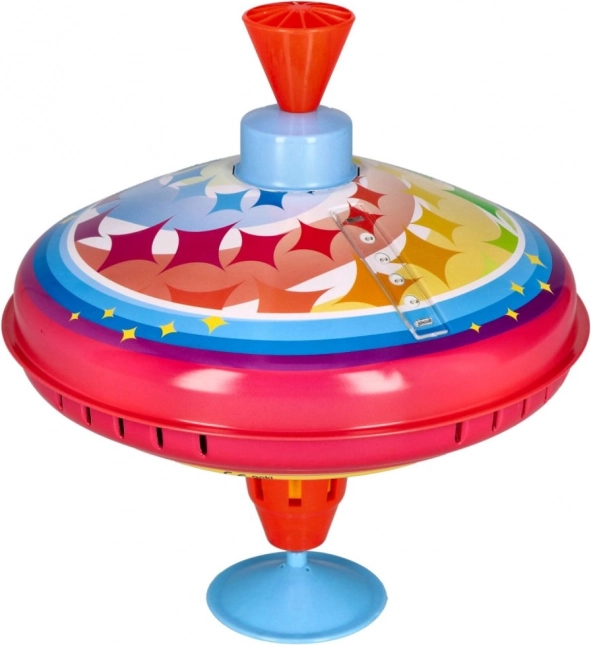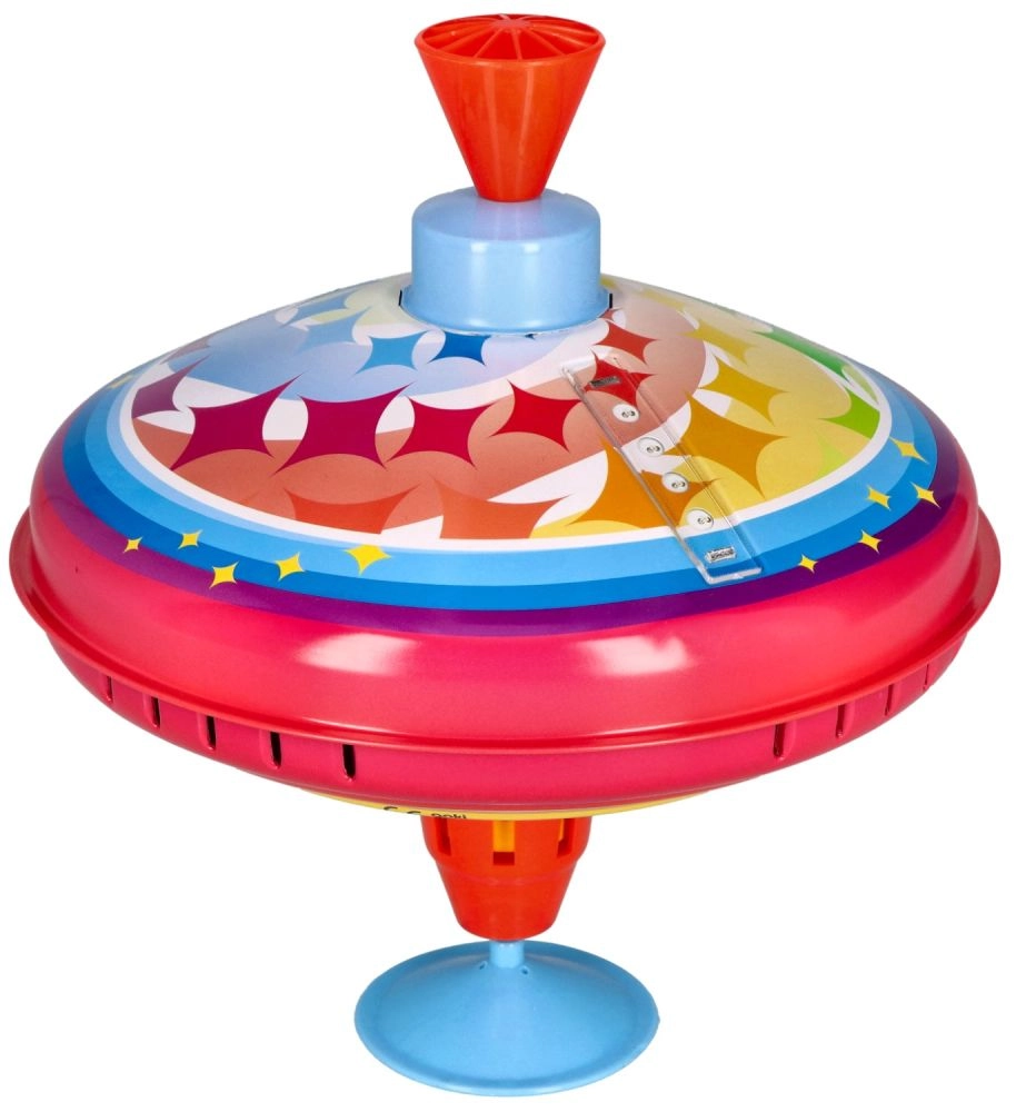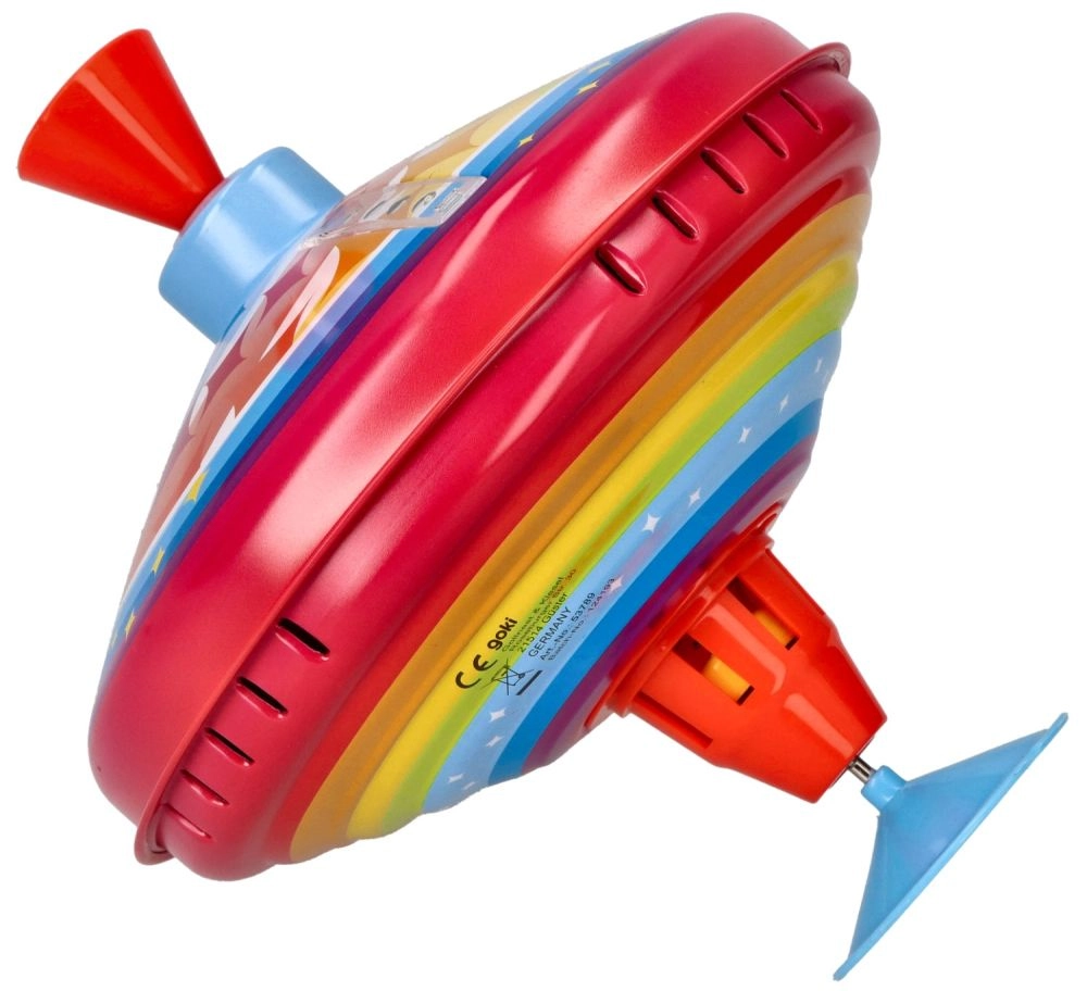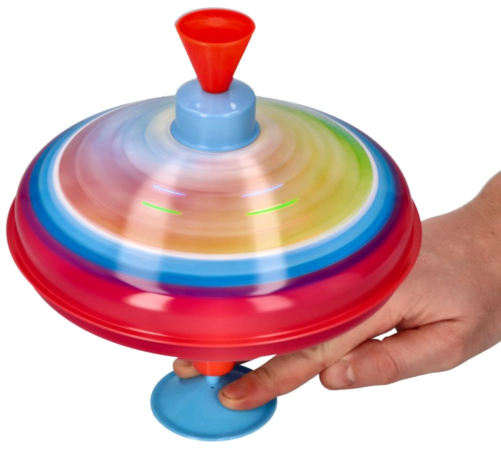 Ontdek de charme van een traditioneel speelgoed in een nieuw jasje. Deze metalen tol met voet wordt in beweging gezet door eenvoudig op de bovenste pomp te drukken. Tijdens het draaien geeft hij een zacht, rustgevend geluid en gaan de geïntegreerde LED-diodes branden, wat aantrekkelijke lichteffecten creëert waar kinderen dol op zijn.