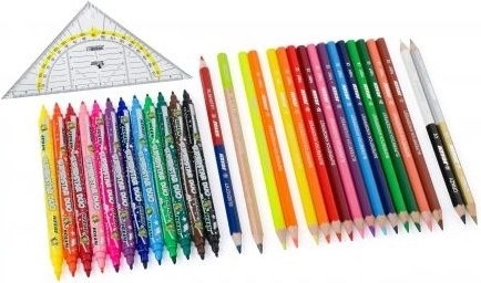 Stimuleer de creativiteit van kinderen met een kleurrijke set potloden en stiften, perfect voor tekenen, inkleuren en de eerste schoolprojecten. Dankzij de compacte afmetingen past hij gemakkelijk in de schooltas en is hij ideaal voor onderweg en in de schoolbank.