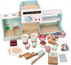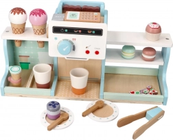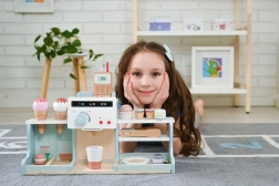 Deze houten ijssalon en koffiebar biedt kinderen een authentieke ervaring van het runnen van een klein bistro. Dankzij de kleurrijke accessoires, draaiknoppen en realistische elementen van de koffiemachine en de ijskraam oefenen kinderen hun fijne motoriek, communicatie en verbeeldingskracht.