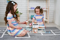 Kinderen kunnen “espresso zetten”, aan de knoppen draaien en gasten bedienen zoals in een kleine koffiebar. Een geweldige basis voor het spelen van barista.