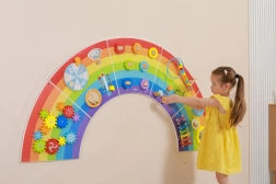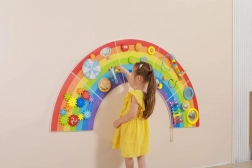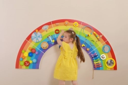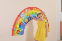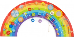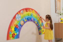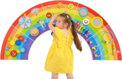 Dit grote regenboog-activiteitspaneel is ideaal voor kinderkamers, speelruimtes en educatieve omgevingen. Kinderen kunnen spelenderwijs oog-handcoördinatie oefenen, geduld trainen en kleuren, vormen, geluiden en het weer ontdekken. De gebogen vorm ondersteunt gelijktijdig spel van kinderen met verschillende lengtes.