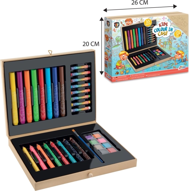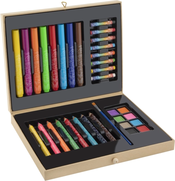 Deze schilderkoffer is een ideale keuze voor de ontwikkeling van de fantasie en fijne motoriek van kinderen. Dankzij het rijke kleurenpalet en de verschillende soorten teken- en schildersbenodigdheden kunnen kinderen tekenen, inkleuren en met waterverf schilderen. Van de eerste lijnen tot voltooide kunstwerkjes – alles in één compacte set.
