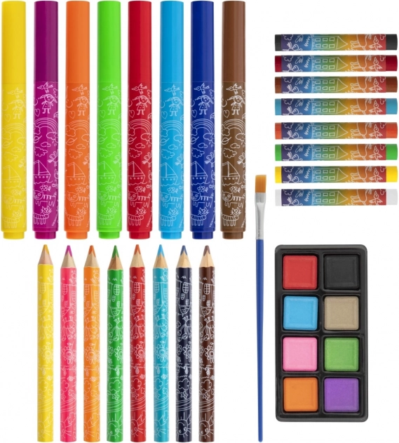 De set met 33 onderdelen biedt een breed palet aan kleuren en tools voor schilderen, tekenen en inkleuren – ideaal voor beginnende kunstenaars.