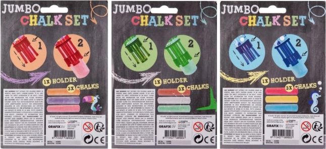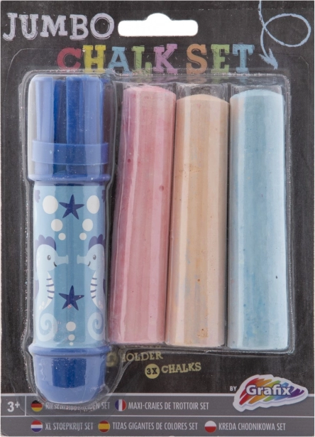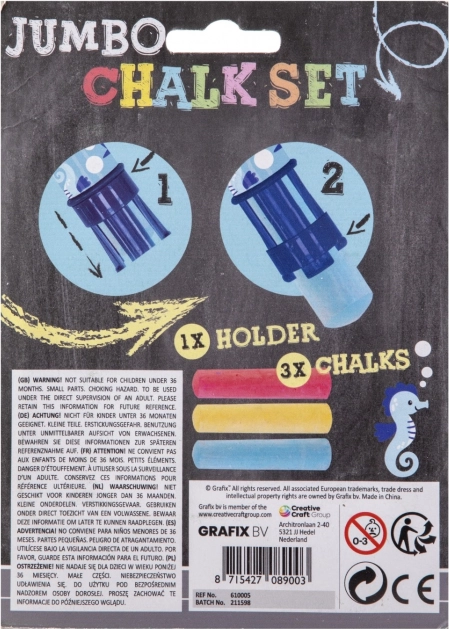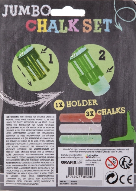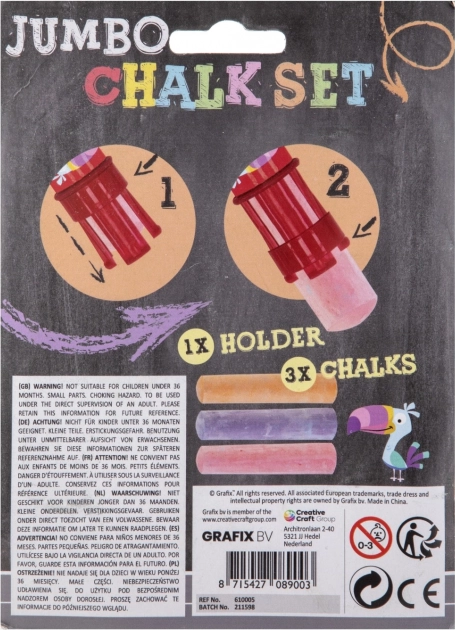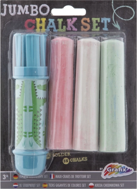 Ontdek het plezier van tekenen op de stoep, de binnenplaats of het schoolplein. Extra dikke jumbo krijtjes liggen goed in de hand en breken minder snel; de houder houdt bovendien je handen schoon en maakt het gebruik makkelijker, ook voor jongere kinderen. De verpakking bevat 3 krijtjes in verschillende kleuren die een duidelijke en gelijkmatige lijn achterlaten.