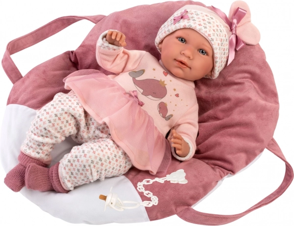De schattige Llorens NEW BORN babypop van 42 cm heeft een zacht stoffen lichaam, realistische gelaatstrekken en zegt na het indrukken van het borstje “mama”, “papa” en maakt huilende babygeluidjes. Dankzij de scharnierende ledematen is ze poseerbaar en kan ze ook zitten. Handgemaakt in Spanje, verpakt in een geschenkdoos.