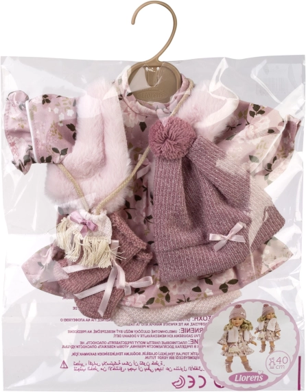 De set bevat ook een stijlvolle hoed met pompon, een sjaal en een kleine tas die de outfit compleet maken.