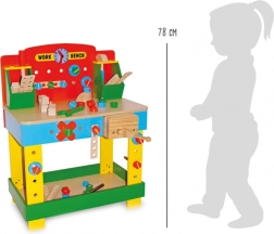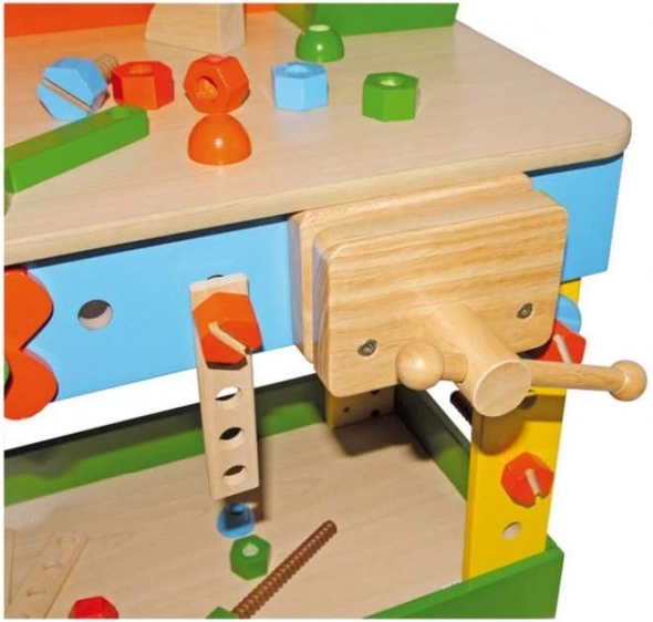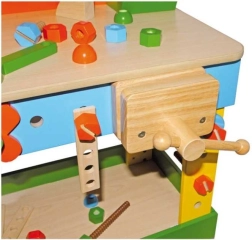 De werktafel heeft een robuuste constructie en voldoende ruimte om te schroeven, te bouwen en fantasierijk te spelen. In de verpakking zitten onderdelen en accessoires volgens de afbeeldingen, zodat kinderen meteen kunnen beginnen met creëren.