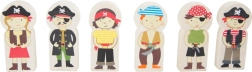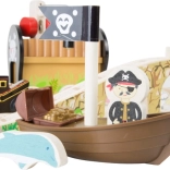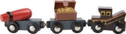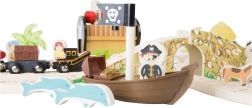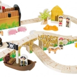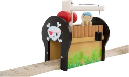 Stap binnen in de wereld van piraten en fantasie. Zes piraten regeren over hun eigen treinbaan op een eiland, waar houten rails over een brug met bel lopen en de trein zowel een kanon als een met goud gevulde kist vervoert. Het kraanstation met een magnetische haak maakt het laden eenvoudig – draai aan het mechanisme en laat de magneet zakken.