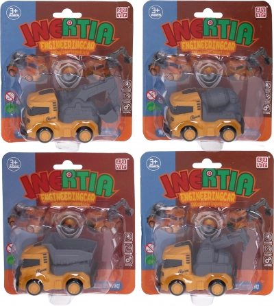 Constructievoertuig met vliegwiel 8,5 cm in 4 varianten: kiepwagen, betonmixer, kraan en graafmachine. Duurzaam, eenvoudig te bedienen en ideaal voor kleine bouwers.