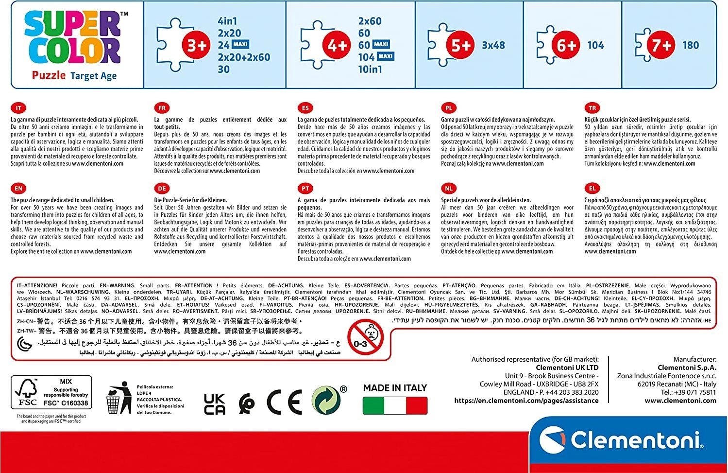 Na het leggen kun je de afbeeldingen weer uit elkaar halen en opnieuw leggen, of ze op karton monteren voor een originele decoratie in de kinderkamer. Het merk Clementoni behoort tot de toonaangevende puzzelfabrikanten ter wereld en staat bekend om de nauwkeurige passing van de stukjes en de hoge materiaal kwaliteit.