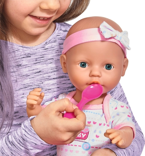 Deze functionele pop in een schattige roze-witte outfit is de ideale metgezel voor dagelijks rollenspel rondom de verzorging van een baby. Kinderen kunnen de pop voeren, laten drinken, een speen geven, de luier verschonen en haar op het potje zetten. Realistische details en beweeglijke oogleden stimuleren de verbeelding en de fijne motoriek.