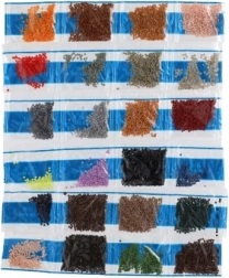- Canvas met voorbedrukt motief en kleeflaag, applicatiepen, schaaltje, was, set gekleurde steentjes, symboollegenda