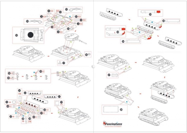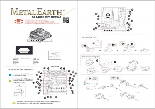 Haal de afzonderlijke onderdelen uit de metalen plaatjes; gebruik indien nodig een kleine zijkniptang (niet inbegrepen). De onderdelen worden met elkaar verbonden via vergrendelingen bestaande uit een lipje en een opening. Buig het lipje met een kleine punttang (niet inbegrepen) en verbind stap voor stap alle vergrendelingen totdat er een zeer realistisch meesterwerk ontstaat!