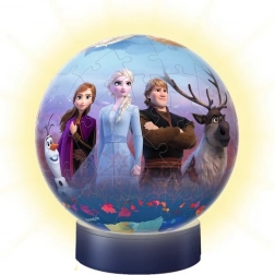 Ontdek de betovering met de Ravensburger 3D Puzzel Bal® Frozen 2, die oplicht na een klap in de handen. Dankzij de perfecte precisie van de 72 plastic stukken creëer je een stevige bal zonder lijm. Speciale gebogen stukken zorgen ervoor dat alles perfect past en de bal stabiel blijft na het in elkaar zetten.